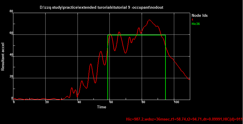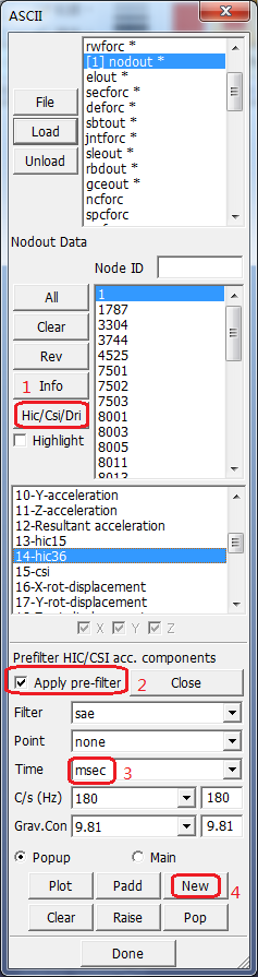 Contents Part IV: Post Tutorials | Chapter 1: Calculate Ooccupant Injury Criterion | Print page 1.4. Plot HIC with Pre-filteringClick the Hic/Cis/Dir button.Activate Apply pre-filter in the lower panel.Select Time: msec in the lower panel.Click New. « 1.3. Generate HIC Plot 1.5. Pre-filtering Explained »