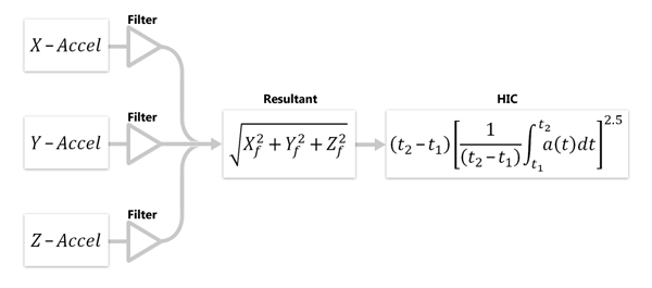 Contents Part IV: Post Tutorials | Chapter 1: Calculate Ooccupant Injury Criterion | Print page 1.5. Pre-filtering ExplainedFigure 7 illustrates the concept of pre-filtering the acceleration signal before calculating HIC. The computation is performed as follows:X, Y, and Z components of acceleration are filtered.Resultant acceleration is plotted.HIC is calculated. « 1.4. Plot HIC with Pre-filtering 1.6. Plot CSI with Pre-filtering »