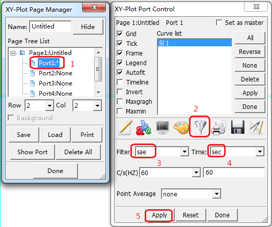 Contents Part IV: Post Tutorials | Chapter 2: Plot a Force vs. Displacement Curve | Print page 2.2. Filter Force vs. Time curveRight-click Port1 in XY-plot Page Manager.Select Control.Click the Set Curve filtering icon (Item 2).Select Filter: sae.Select Time: sec.Click Apply. « 2.1. Plot Force vs. Time curve 2.3. Save Force vs. Time curve »