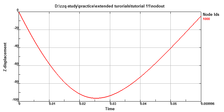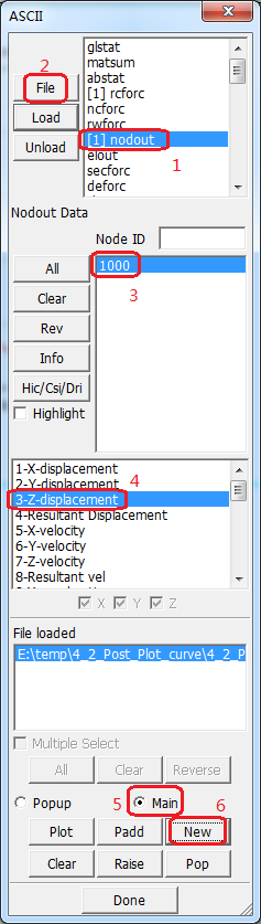 Contents Part IV: Post Tutorials | Chapter 2: Plot a Force vs. Displacement Curve | Print page 2.4. Plot Displacement vs. Time curveClick FEM > Post > ASCII.Select nodout from the upper list.Click File.Open nodout.Select 1000 from the middle list.Select Z-displacement from the lower list.Select Main and click New. « 2.3. Save Force vs. Time curve 2.5. Invert Displacement vs. Time curve »