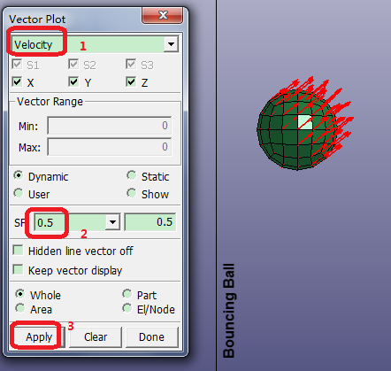 Contents Part IV: Post Tutorials | Chapter 4: Introduction to Various Page 1 Post-Processing Tools | Print page 4.7. Display the Ball's Velocity Using the Vector InterfaceClick FEM > Post > Vector.Select Velocity from the drop-down menu.Set SF: 0.5.Click Apply. « 4.6. Adjust the Location of the Section Cut 4.8. Plot the Stress Contour Using the Fcomp Interface »