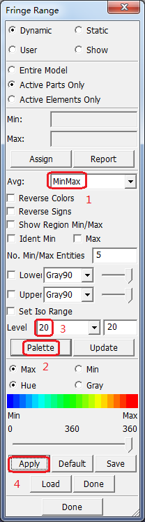 Contents Part IV: Post Tutorials | Chapter 4: Introduction to Various Page 1 Post-Processing Tools | Print page 4.9. Adjust the Contour Legend Using the Range InterfaceClick FEM > Fringe Range.Set Avg: MinMax (shows better contours).Activate Palette.Set Levels: 20.Click Apply. « 4.8. Plot the Stress Contour Using the Fcomp Interface 4.10. Mask Some Elements Using the Blank Interface »