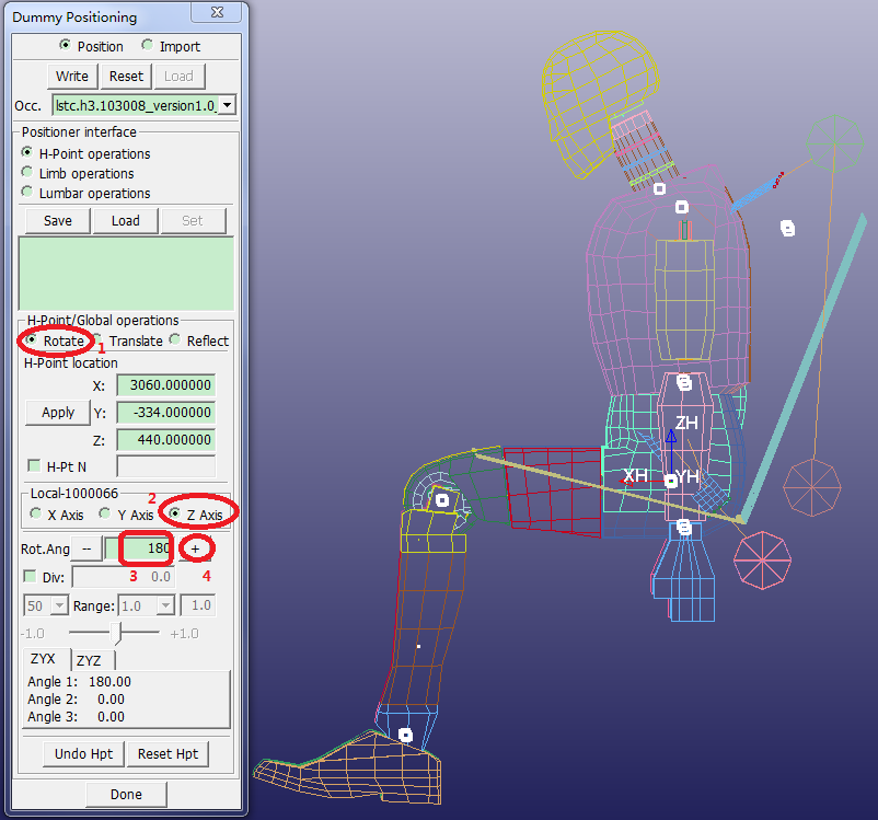 Contents Part V: Application Tutorials | Chapter 1: Introduction to Dummy Positioning | Print page 1.4. Rotate Dummy to Face ForwardSelect Rotate in the side panel.Select Z Axis.Enter Rot. Ang. = 180, then press Enter on the keyboard.Click +. « 1.3. Translate Dummy to Correct H-Point 1.5. Recline Dummy in Seat »