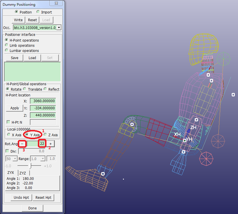 Contents Part V: Application Tutorials | Chapter 1: Introduction to Dummy Positioning | Print page 1.5. Recline Dummy in SeatSelect Y Axis in the bottom panel.Enter Rot. Ang. = 22, then press Enter on the keyboard.Click −. « 1.4. Rotate Dummy to Face Forward 1.6. Position Lower Arms »