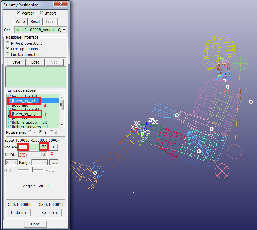 Contents Part V: Application Tutorials | Chapter 1: Introduction to Dummy Positioning | Print page 1.7. Position Lower LegsSelect lower_leg_right from the list.Enter Rot. Ang. = 20, then press Enter on the keyboard.Click −.Select lower_leg_left from the list.Click −. « 1.6. Position Lower Arms 1.8. Create Part Set for Seatbelt Contact »