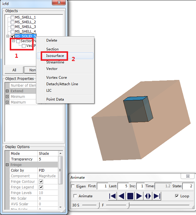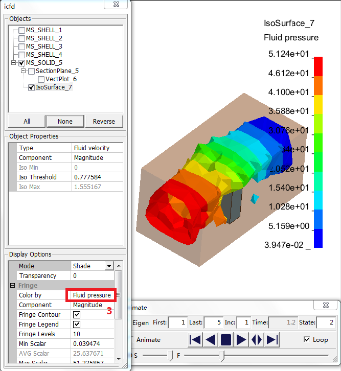 Contents Part VI: MultiSolver Tutorials | Chapter 1: Introduction to ICFD Post Processor | Print page 1.2. ISO SurfaceDeselect SectionPlane_5 and VectorPlot_6.Right-click item MS_SOLID_5, and select Isosurface. « 1.1. Section Plane 1.3. Stream Line »