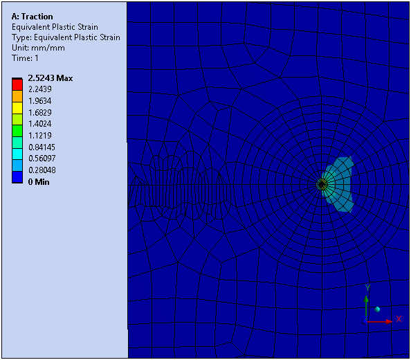 This tutorial illustrates a fracture analysis of a 2D cracked specimen under a tensile load. The crack is modeled at the geometry level and the appropriate mesh controls are already defined. The fracture parameters are post-processed using a J-Integral approach that supports plastic material behavior.