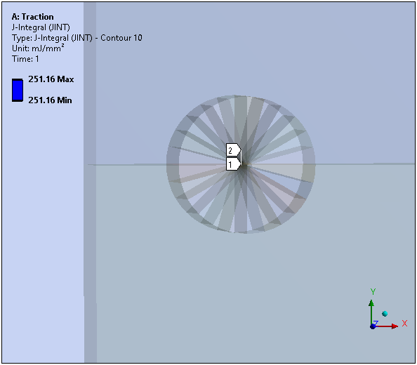 View the results and the Tabular Data for each result. The Tabular Data displays the J-Integral results at the crack front node for each integration contour.