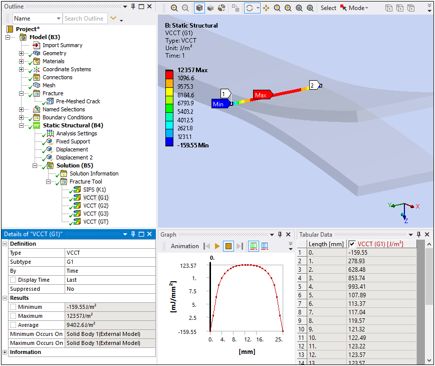 Since the load applied on the crack faces is tensile, the Mode I energy release rate ((VCCT (G1) ) ) dominates in this case. The VCCT(G2) and VCCT(G3) results are approximately zero. The total energy release rate (VCCT (GT) ) is approximately equivalent to VCCT(G1)