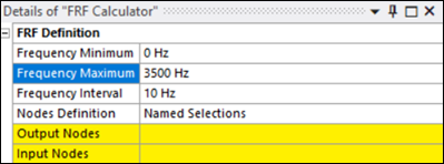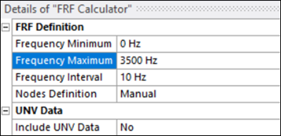 Set the Details for the FRF Calculator object as shown below. This frequency range (0 – 3500Hz) is chosen to account for the first six eigenvalues for this case.