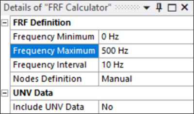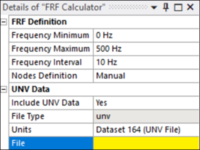 In the Details panel for the FRF Calculator, set Include UNV Data to and confirm that the File Type property is set to and that the FRF Calculator is undefined.