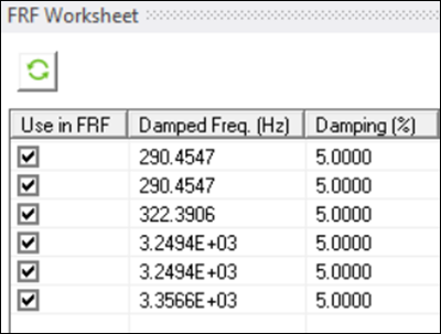 Change the Damping (%) from 2.0 to 5.0 in the FRF Worksheet Table 1 (Frequency Table) and the FRF Calculator.