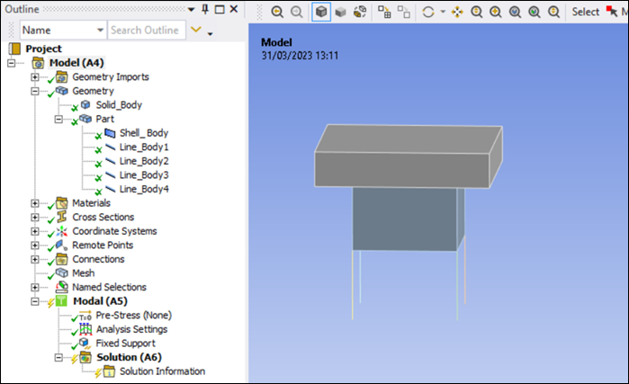 The geometry consists of a solid body, a shell body and four line bodies as shown in the figure below.