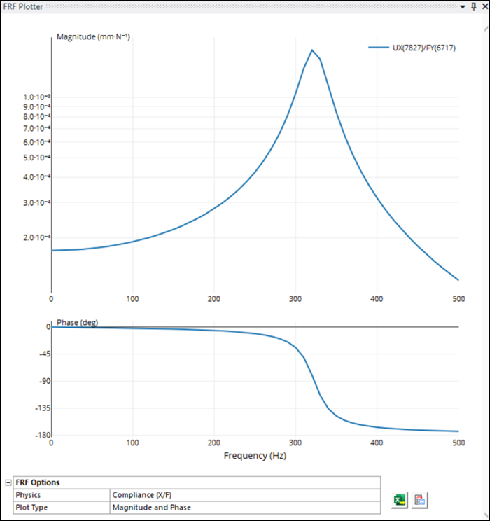 In addition to the Plot Type, you can toggle between different Physics types to plot , or curves. For example, is a measure of how much a structure moves (displacement, X) for a unit input of force (F). and are other common ways to display the FRF. uses units of velocity over force, whereas uses units of acceleration over force. Refer to the FRF Calculation Method documentation for more mathematical details on these options.