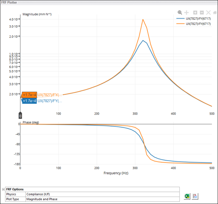 Uncheck all rows in FRF Worksheet Table 2 (DOF Pairs – rst type) except the first and observe that the FRF Plot is available only for first DOF pair which shows magnitude and phase vs frequency.