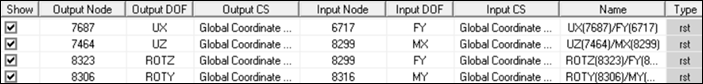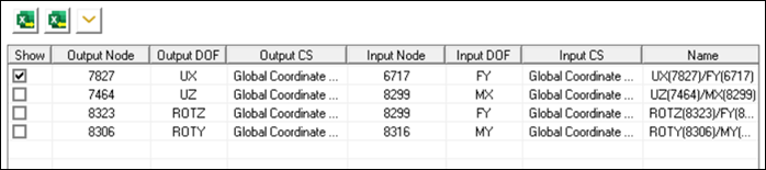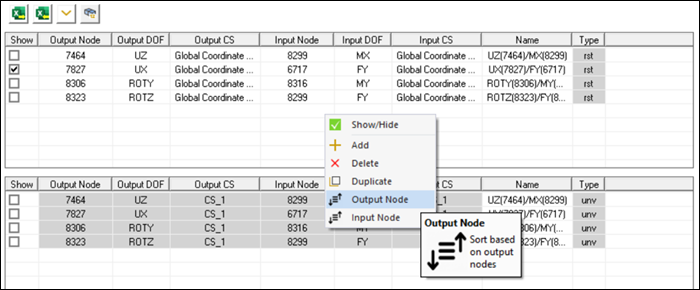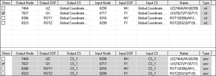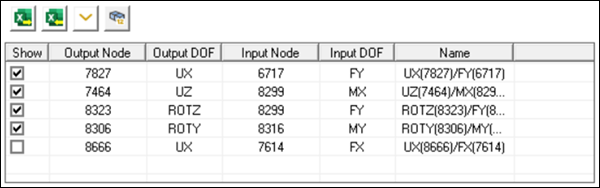 Import the unv file that was exported in Step 8b. Confirm that details shown below are available in the FRF Worksheet showing unv node data in Table 3 (DOF Pairs – unv type).