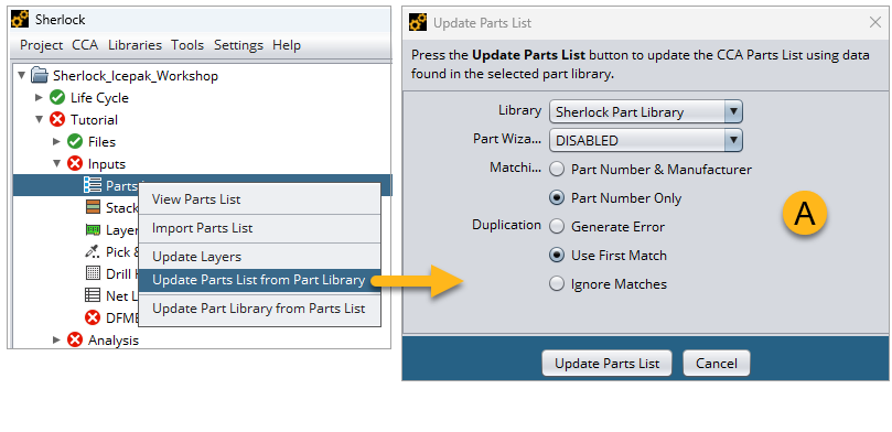 Once the Sherlock project is created, update the Parts List from the Part Library: Right-click the Parts List in the Project Tree and click Update Parts List from Part Library in the context menu. Using the options shown below (A), click the button.