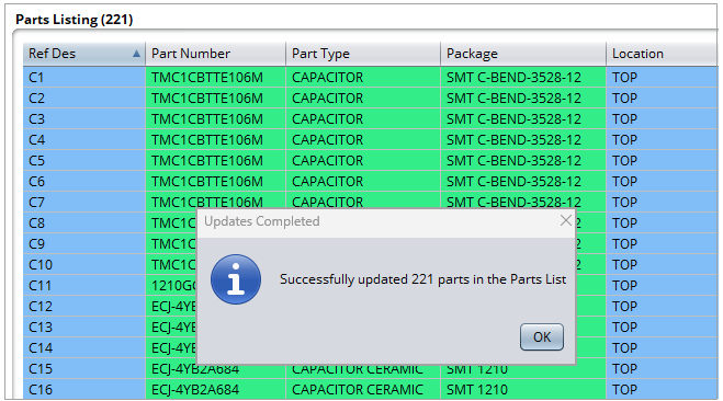 When the update is complete, confirmed entries in the Parts List are shaded green. Click to continue.