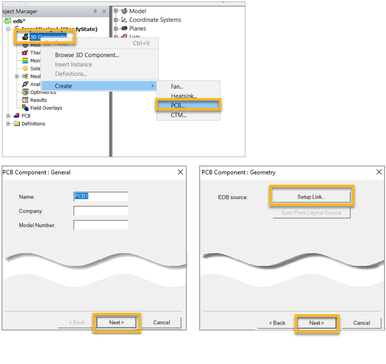The EDB file imported earlier from the Sherlock application already has assigned materials. But you can choose not to import components here and use their detailed CAD models