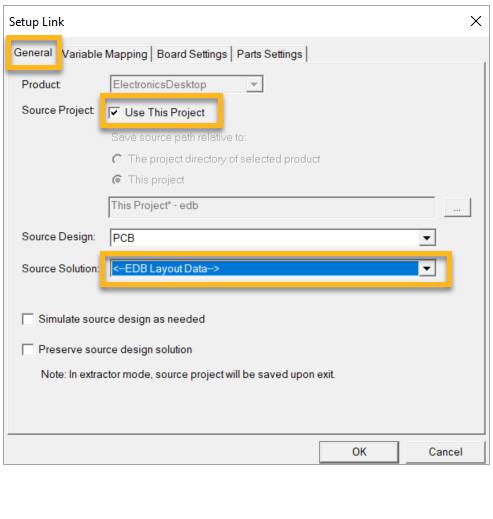 In the General tab of the Setup Link window, enable Use This Project. For Source Solution, select EDB Layout Data so the Icepak application automatically selects the available HFSS 3D Layout Design.