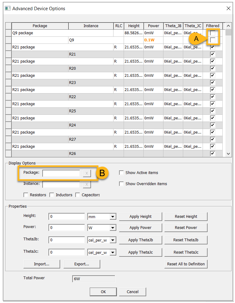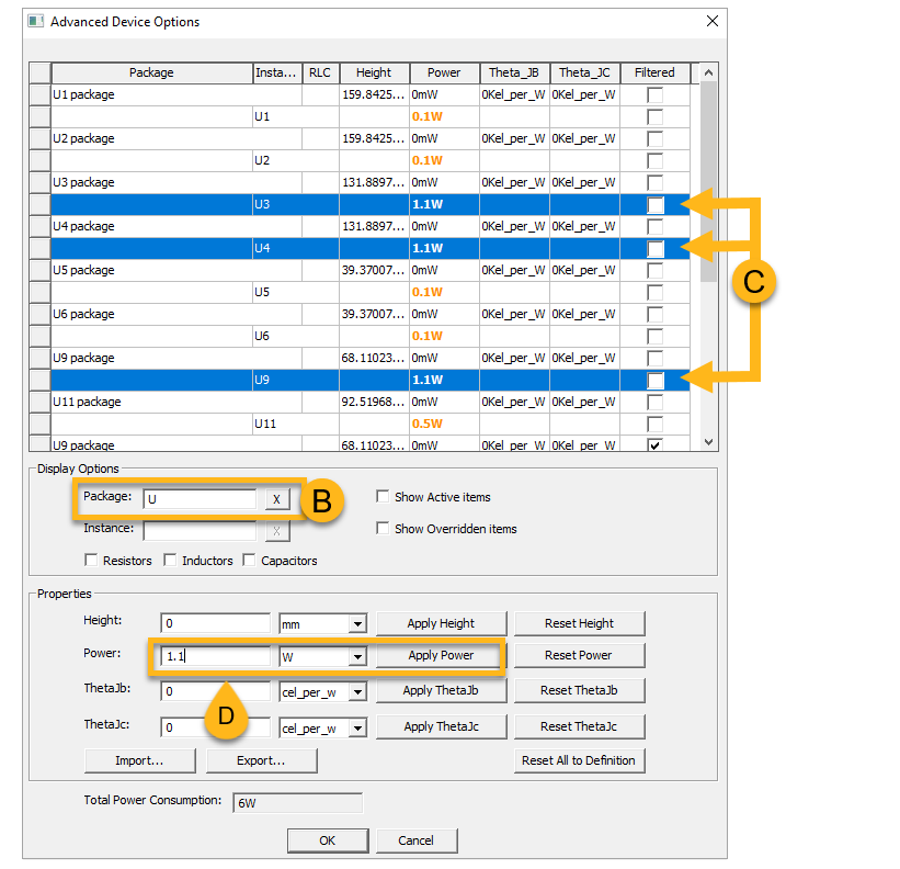 Components Power (W) Q9, Q10, Q11, Q12, Q13, Q14, Q15, Q16 0.1 W U1, U2, U5, U6 0.1 W U11, U12, U13 0.5 W U3, U4, U9 1.1 W To include a part in the simulation, make sure the check box under Filtered is empty (A, below).