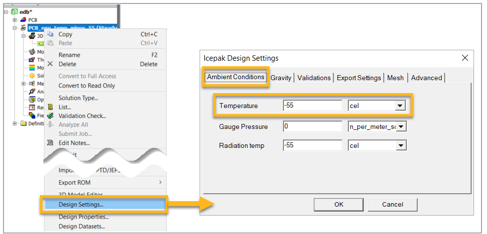 You will run the simulation at two different ambient temperatures (-55°C, 85°C) because the thermal cycling profile in Sherlock has two different steady state temperatures. For now, set ambient temperature to -55°C as shown below. The 85°C temperature will be handled later in the tutorial.