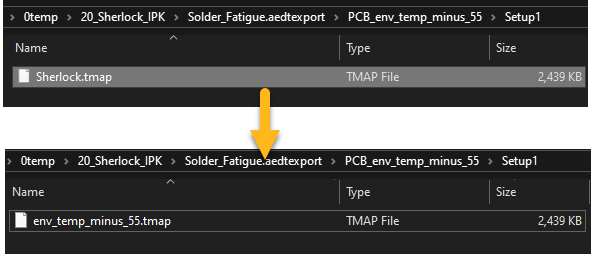 Contents Chapter 3: Icepak: Setting Up the Thermal Simulation | Print page 3.13. Verify the Exported .tmap FileBrowse to AEDT project folder location and find folder *.aedtexport. Inside the *.aedtexport folder, locate the .tmap file which can be imported into the Sherlock for mapping temperatures. Rename this file to env_temp_minus_55.tmap. « 3.12. Verify the Solution Convergence and Thermal Results 3.14. Create a Copy of the Icepak Design »