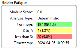 In the Summary tab, the Solder Fatigue section shows a module score of 0.0.