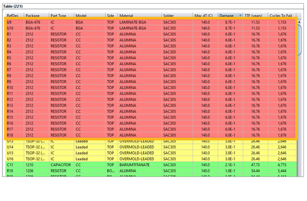 Notice the components highlighted in red, meaning these parts failed the Solder Fatigue analysis.