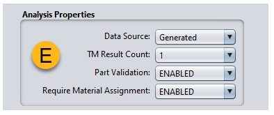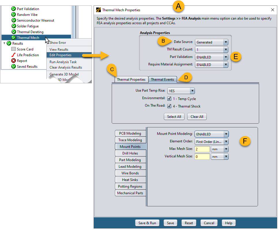 The inputs required for the analysis (with Data Source (B) set to Generated) can be seen in the image below. They are categorized into: Thermal Properties(C), Thermal Events (D), Analysis Properties (E), and Modeling Properties (F).