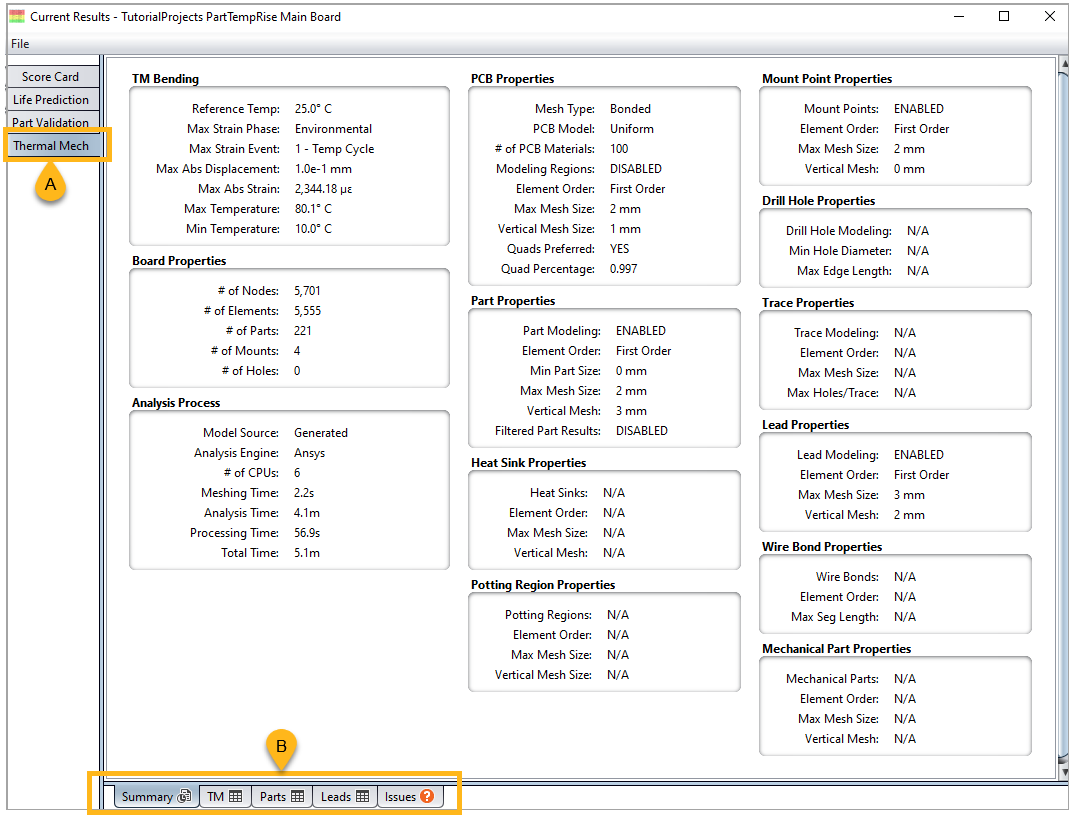 The View Results option opens the Current Results window with the Thermal Mech tab selected (A, in the image below). Use the bottom row of tabs (B) to access results on different aspects of the analysis: Summary, TM (Thermal Mech), Parts, and Leads. In certain conditions, other tabs (such as an Error or Issues tab) might appear.
