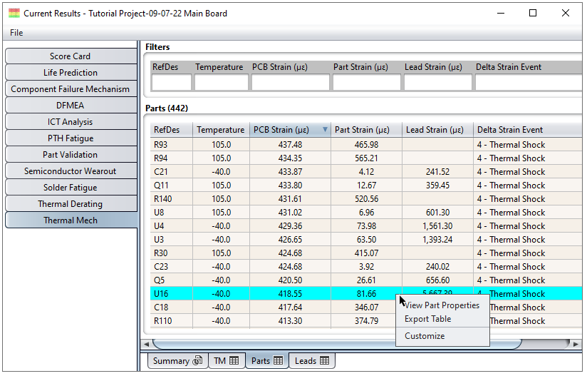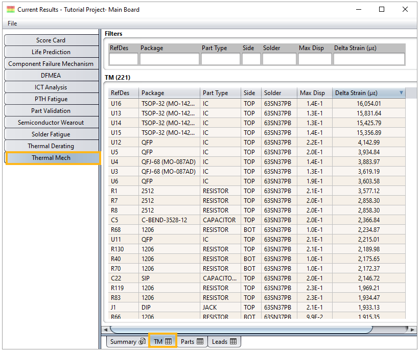 Parts Tab: The table in the Parts tab lists three strains for all the parts on the board: 1) PCB Strain, 2) Part Strain, and (3) Lead Strain. If the part is not leaded, the Lead Strain column will be empty.