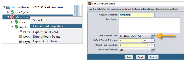 To determine or to set the Default Solder Type for the circuit card, right-click the circuit card in the Project Tree and select Circuit Card Properties as shown below.