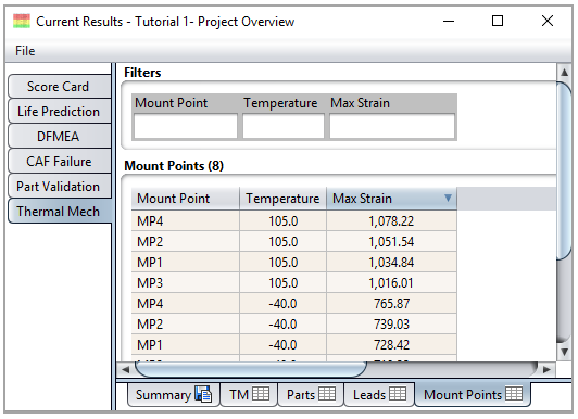 Other Tabs: You will find additional tabs in the Current Results Table for further exploration. Which tabs appear depends on the unique features of your board and whether you chose to model them for the analysis. In the example below, there is a Mount Points tab because four mount points were added to the board and Mount Point Modeling was ENABLED in the Thermal Mech Properties dialog.