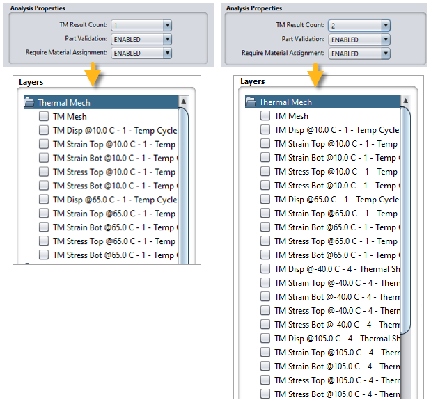 In the case of multiple Thermal Events, the Layer Viewer will display results for the Event(s) that caused maximum displacement. How many Events are displayed is limited by what you entered for the TM Result Count (as illustrated in the image below). Also, to avoid cluttering the display, Sherlock displays a maximum of four Thermal Events in the Layer Viewer