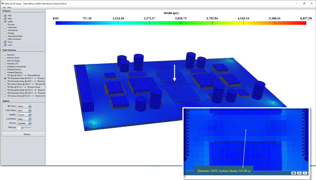 You can view elemental stress and strain in using Sherlock's 3D Viewer. Sherlock also provides options to view displacement and surface strains in the 3D Viewer to compare the contour with that of the Layer Viewer. The inset below illustrates how the 3D Viewer allows you to view surface strain by simply hovering the mouse over a specific element. (See Viewing 3D Results for details.)