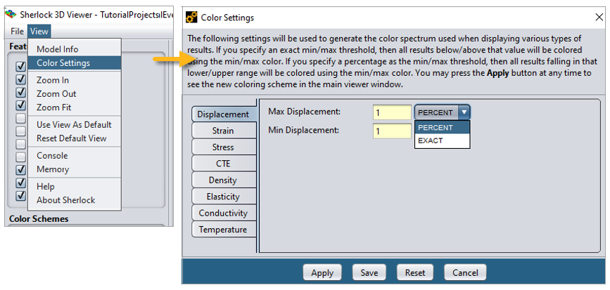 Note: In the 3D Viewer, when viewing any of the color schemes related to material properties (Material CTE, Material Conductivity, Material Density, and Material Elasticity), the values represented are for the material at reference temperature only.