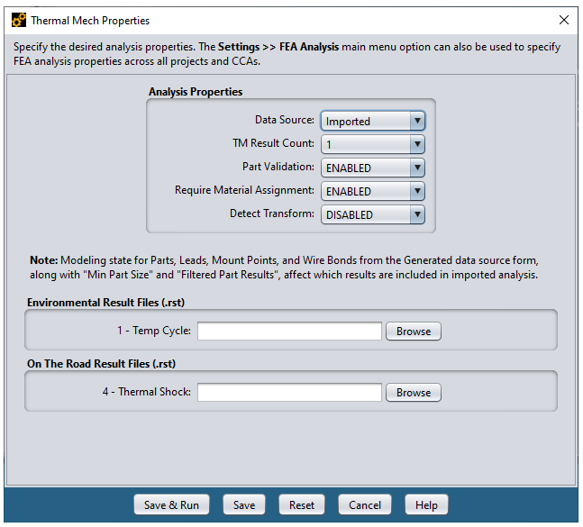 In the Thermal Mech Properties dialog, when you choose Imported as the Data Source, the interface changes as shown below. Use this interface to import thermal mech analysis results (.rst) from Ansys Workbench to Sherlock.