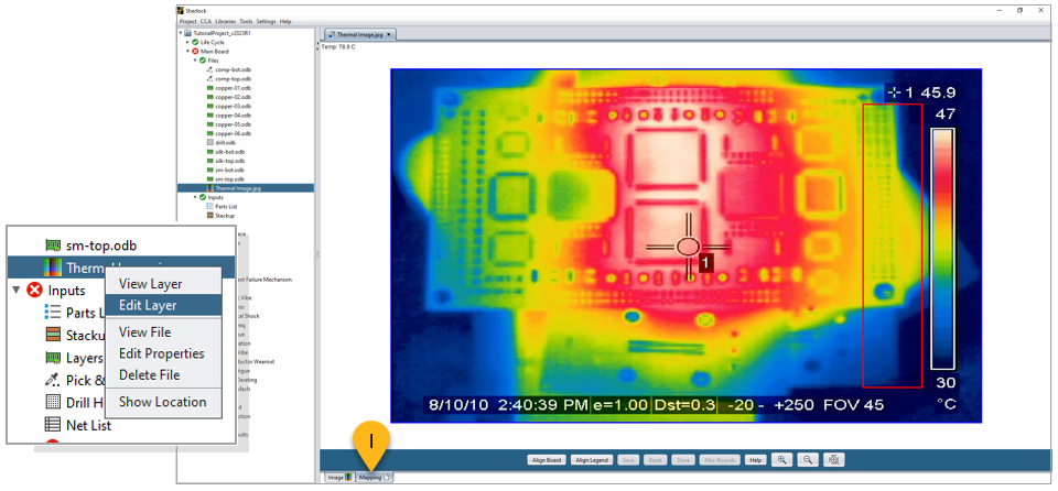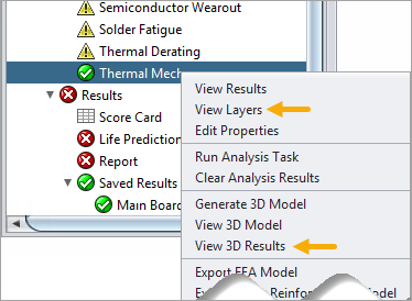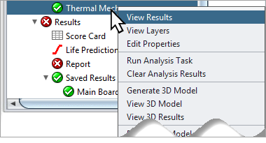 Sherlock provides graphical representations of the results which you can access using the 2D Layer Viewer and the 3D Viewer. To open the viewers, right-click Thermal Mech in the Project Tree. In the context menu, select View Layers or View 3D Results. The results provided in the 2D Layer Viewer are only for the PCB and not for the parts on the board. Use the Sherlock 3D Viewer for viewing parts and leads. For a complete guide to using the viewers, refer to Viewing and Managing Analysis Results.