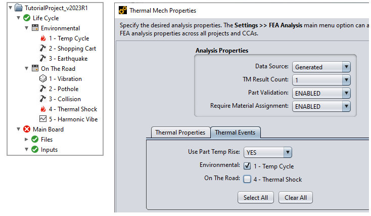 Note: If the Thermal Events tab is inactive, clear any data from the Custom Uniform Temperature field under the Thermal Properties tab. Any data in the field automatically deactivates the tab.