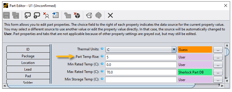 It should be noted that Part Temp Rise value set under each part will be used only if Use Part Temp Rise is set to YES. In the Part Editor, Part Temp Rise can either take a positive value for temperature or can be set to DEFAULT. When a part is set to DEFAULT, Sherlock does not apply any temperature boundary condition to the part but rather solves for its respective nodal temperature based on other boundary conditions.