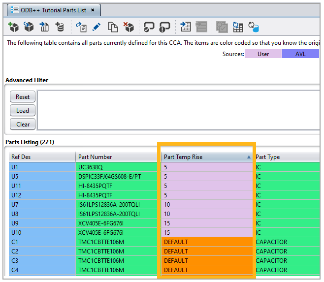 Part Temp Rise for all the parts in the circuit card can be viewed under the Parts List as shown below. You may need to customize the table to see the Part Temp Rise column as explained in Customizing the Parts List.