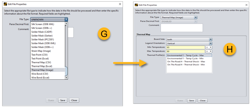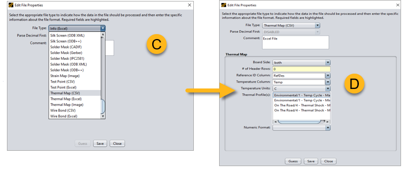 Example: To edit the CSV file, right-click the ThermalMapCSV.csv (B, above) in the project tree. This opens the Edit File Properties window (C, below). In Edit File Properties window, change the File Type to Thermal Map (CSV). This displays the Thermal Map panel (D).