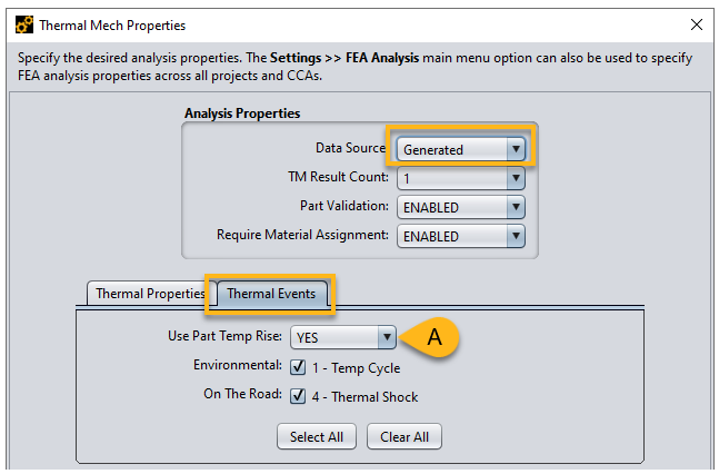 Thermal Events with Part Temperature Rise: Select YES for Part Temp Rise (A, above) if you want Sherlock to incorporate the Part Temp Rise property into its analysis. Part Temp Rise is a part property that specifies a part's temperature rise that occurs during the device's operating conditions.