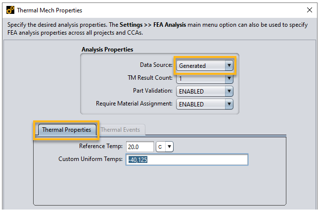 For this kind of analysis, you select Generated as the data source in the Thermal Mech Properties window, as shown below. Use the Thermal Events tab to select which Thermal Events apply to the analysis.