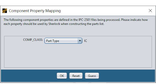The Component Property Mapping dialog is an important, but sometimes overlooked, dialog that allows you to map various component/part properties included in the IPC-2581 file to corresponding Sherlock property fields. Sherlock parses any BomItem description and BomItem textual characteristics found in the IPC-2581 file to produce this dialog. The item COMP_CLASS in this example was found and the value IC was an example value found in the file. If desired, the indicated Sherlock part property will be assigned the values found for COMP_CLASS associated with each part found. If the indicated Sherlock part property is not correct or the indicated IPC-2581 property doesn't apply, change the selection to the correct Sherlock part property or to the value of Ignore.