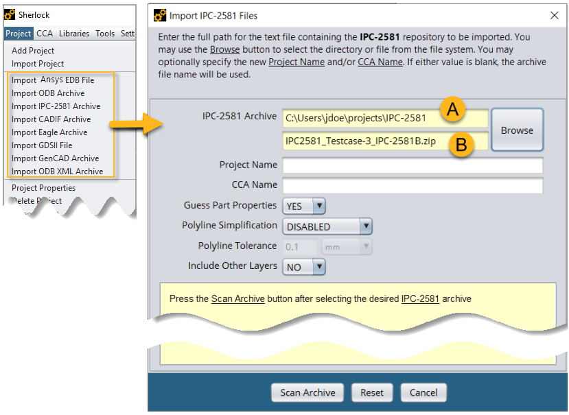As mentioned earlier, you can import a variety of industry-standard file types into Sherlock. Simply click Project from the Main Menu and select one of the Import... options. This will open the dialog for the specific file type you chose. The Import IPC-2581 dialog is shown below as an example of the import interface. Click the Browse button to navigate to the file you wish to import. Notice the top field (A, below) displays the file path. The second field (B) displays the file name.