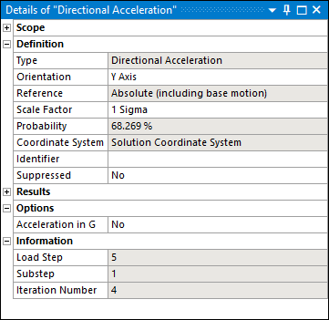 For directional acceleration results, set the Acceleration in G property to to display the result using the acceleration unit G.