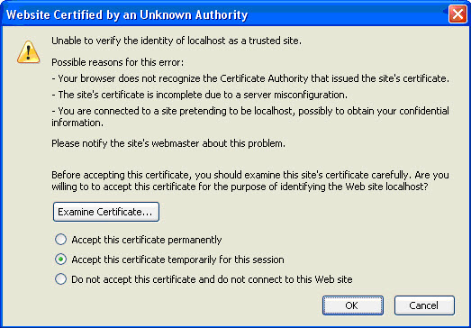 A certificate that is signed by the same party that created it is known as a self-signed certificate. When an internally-generated certificate is signed using an in-house Certificate Authority, then a self-signed certificate is created. Self-signed certificates are perfectly usable for enabling HTTPS connections to a web server. However, when a browser encounters a certificate that has been signed by an unknown certificate authority, it will present the user with a warning, such as the following: