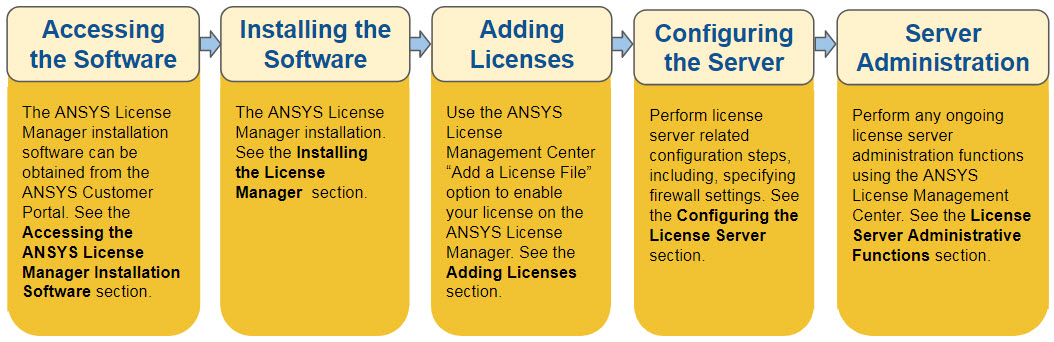 The following sections describe the basic steps required to set up your license server. These instructions follow the Ansys Licensing Life-Cycle below.